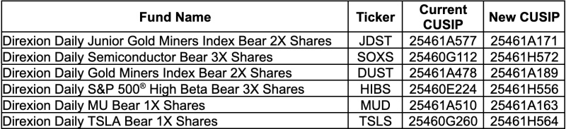 Direxion, a leading provider of ETFs for tactical traders, has announced it will execute a reverse split of the issued and outstanding shares of the Direxion Daily Junior Gold Miners Index Bear 2X Shares, Direxion Daily Semiconductor Bear 3X Shares, Direxion Daily Gold Miners Index Bear 2X Shares, Daily S&P 500 High Beta Bear 3X Shares, Direxion Daily MU Bear 1X Shares and Direxion Daily TSLA Bear 1X Shares, (the “Funds”). The total market value of the shares outstanding will not be affected as a result of this split, except with respect to the redemption of fractional shares, as outlined below.