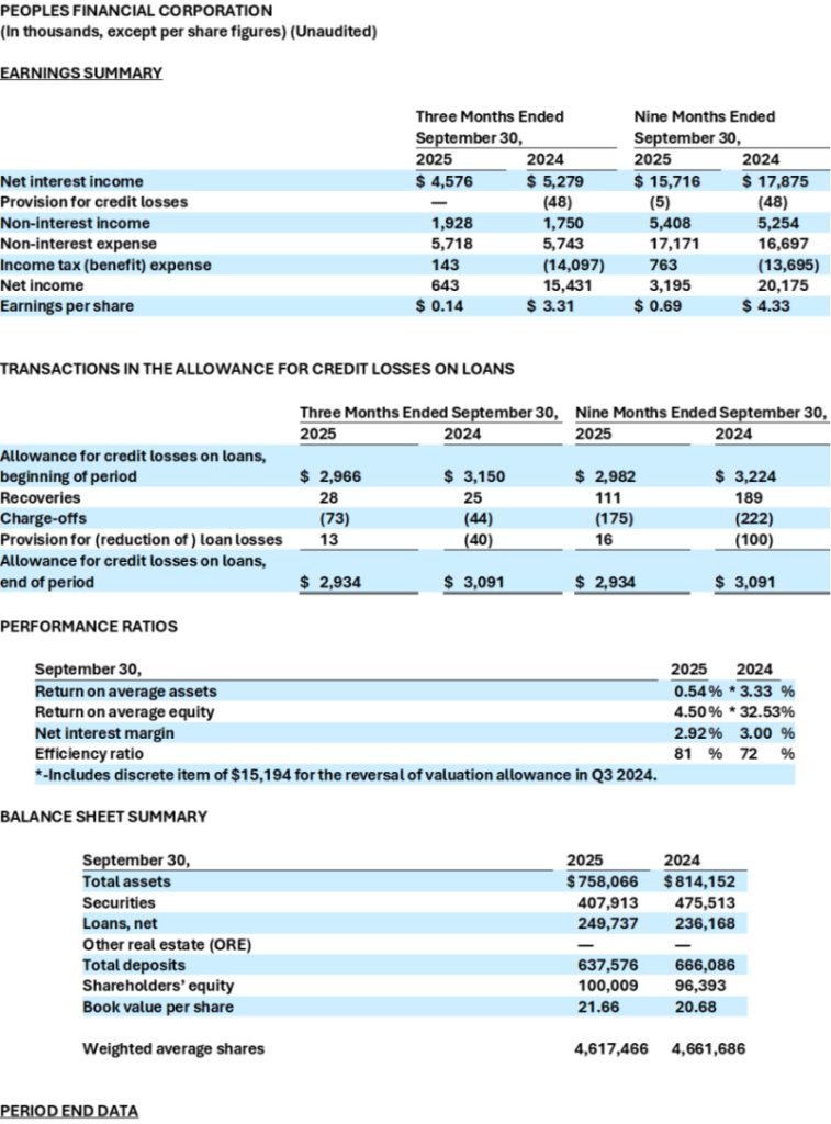 Peoples Financial Corporation (the “Company”)(OTCQX Best Market: PFBX), parent of The Peoples Bank (the “Bank”), announced earnings for the third quarter ending September 30, 2025.